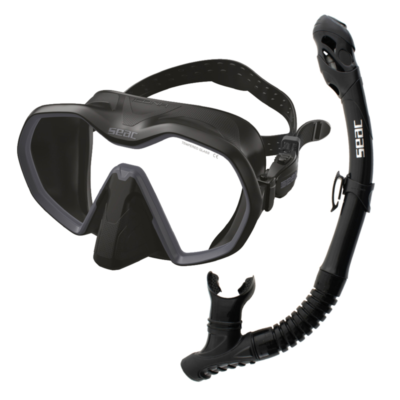 Dette dykker sæt inkluderer masken Seac Icona og snorklen Seac Reverse Dry, begge med høj kvalitet til dykning.